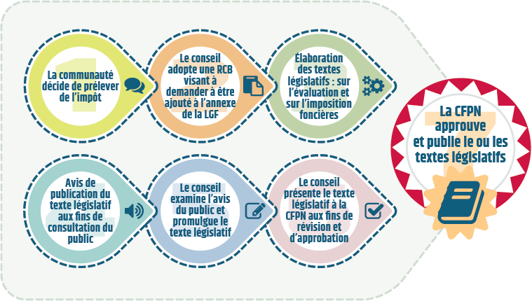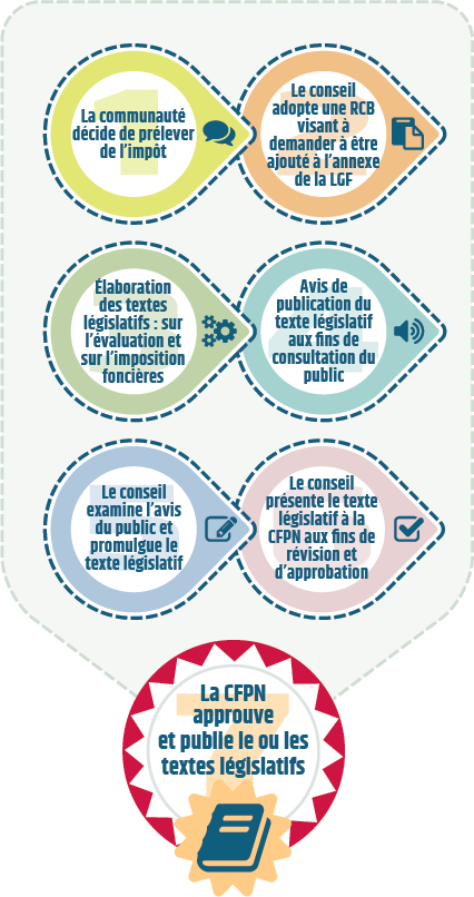 L’élaboration d’un système fiscal des Premières nations en vertu de la Loi sur la gestion financière (LGF) commence par l’élaboration de textes législatifs sur l’impôt foncier de base. Les Premières nations confient en général à leur administrateur fiscal ou administratrice fiscale la responsabilité consistant à élaborer les textes législatifs sur l’impôt foncier, avec l’aide du conseiller ou de la conseillère juridique de la Première nation et du personnel de la Commission de la fiscalité des premières nations (CFPN). Ce dernier collabore étroitement avec la Première nation afin de veiller à ce que les textes législatifs proposés par la Première nation respectent la LGF et les normes de la CFPN.